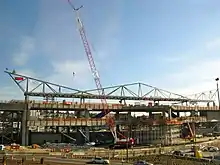 On September 22, 2006, Sound Transit and the Port of Seattle broke ground on the Airport Link extension, beginning three years of light rail and roadway construction.[48][49] The airport's return-to-terminal ramps were closed for demolition in October, clearing the site of the future station.[50] Construction of the SeaTac/Airport light rail station was bid out to Mowat Construction for $35.8 million in July 2007; the initial bid in March was set above Sound Transit's estimates at $95.3 million by Mowat, the sole bidder, and subsequently reduced the scope of the contract and removed elements of the station to bring costs down.[51][52] A second contract signed with Mowat in February 2008 brought the total cost of the station's construction to $72 million.[53] The 1.7-mile-long (2.7 km) light rail guideway approaching the station would be built by PCL Construction as $38 million addition to their contract to build the guideway in Tukwila.[54]