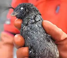 The hunting of seabirds and the collecting of seabird eggs have contributed to the declines of many species, and the extinction of several, including the great auk and the spectacled cormorant. Seabirds have been hunted for food by coastal peoples throughout history—one of the earliest instances known is in southern Chile, where archaeological excavations in middens has shown hunting of albatrosses, cormorants and shearwaters from 5000 BP.[77] This pressure has led to some species becoming extinct in many places; in particular, at least 20 species of an original 29 no longer breed on Easter Island. In the 19th century, the hunting of seabirds for fat deposits and feathers for the millinery trade reached industrial levels. Muttonbirding (harvesting shearwater chicks) developed as important industries in both New Zealand and Tasmania, and the name of one species, the providence petrel, is derived from its seemingly miraculous arrival on Norfolk Island where it provided a windfall for starving European settlers.[78] In the Falkland Islands, hundreds of thousands of penguins were harvested for their oil each year. Seabird eggs have also long been an important source of food for sailors undertaking long sea voyages, as well as being taken when settlements grow in areas near a colony. Eggers from San Francisco took almost half a million eggs a year from the Farallon Islands in the mid-19th century, a period in the islands' history from which the seabird species are still recovering.[79]