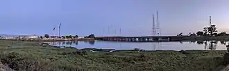 The mouth is characterized by a marshy area and an extent of bay mud extending approximately 700 m (2,300 ft) northward into San Francisco Bay. The mouth is crossed by the Seal Slough Bridge carrying East Third Avenue / J Hart Clinton Drive, completed in 1985,[11] and a narrower, older bridge previously used by the road and now part of the San Francisco Bay Trail. Seal Slough is separated from Marina Lagoon by a small earthen dam, which has tidal gates at the south end, and gravity or pumped flow at the north end.[12]: 17 Near the downstream / northern end of Marina Lagoon is situated the city of San Mateo Wastewater Treatment Plant, Bayside School, and Bayside/Joinville Park on the western/southern bank; on the northern/eastern bank is the Mariner's Island residential development. In between, a small island near the dam, accessible by boat, is preserved as Lagoon Island Park.