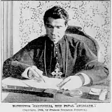 [Bishop Martinelli speaks] excellent English, with only a slight accent.[note 1] His voice is soft and musical, and he is very graceful, with an attractive manner. He is a small man, not over 5 feet 5 inches in height, of good build, and he has a typical Italian face. He is very dark, his hair is black and his eyes brilliantly black. The eyes are of the kind that seem to look clear through one. They are the most pronounced feature of their possessor. He has a very square jaw, and when he smiles there is a slight curl of the under lip [sic]. Altogether the face is one that strikes an observer as that of a more than ordinarily intelligent man.[6]
