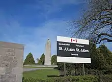 The village of St. Julien (now Sint-Juliaan; 50.890°N 2.937°E) was in the rear of the 1st Canadian Division until the poison-gas attack of 22 April, when it became the front line. Some of the first fighting in the village involved the stand of lance corporal Frederick Fisher of the 13th Battalion CEF's machine-gun detachment; Fisher went out twice with a handful of men and a Colt machine gun, preventing advancing German troops from passing through St. Julien into the rear of the Canadian front line. He was killed the following day.[13]