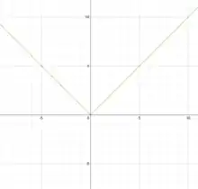 Graph of the absolute value function. Note the sharp turn at x = 0, leading to non-differentiability of the curve at x = 0. The function hence possesses no ordinary derivative at x = 0. The symmetric derivative, however, exists for the function at x = 0.