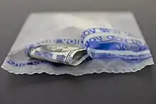 A security bag is a heavy duty bag used to contain high-value products or documents or legally sensitive items. Envelopes with security features are called security envelopes as well as security bags. Cash for deposit in a bank is often placed in a special deposit bag with security features.[1][2] When used to contain items related to a crime, special evidence bags are used.[3] Authentication of signatures and chain of custody are often required.