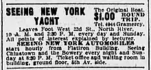 The "Seeing Yacht," for a fare of $1, gave a three-hour tour that circled "the island of Manhatton[sic], showing the statue of Liberty, Blackwell's island [now Roosevelt Island], Jersey City, Brooklyn, Harlem, Bronx, the navy yard, the ocean liners and the wharves, with their commerce and extensive shipping interests."[6][1]
