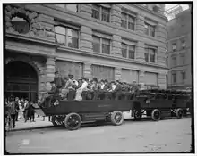 Tours in open-topped buses left from the Flatiron Building (then the Fuller Building), where the windows were painted to advertise "coaches, automobiles, and yachts".[3] The men wore suits, the women wore gloves and elaborate, often feathered hats. They visited "the historic section, in its Dutch, British and American periods; the Bowery, Chinatown, Brooklyn, Castle Garden, Central Park, the Grand Boulevards, the historic Hudson river, Columbia University, General Grant's tomb, [and] statues of Christopher Columbus and William Shakespeare."[1] By 1913, manager J. H. Mulligan and local manager R. H. Green were operating eight vehicles.[2] In 1904 The Evening World described the tours: