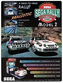 Sega Rally Championship is a 1994 racing video game developed by Sega AM3 and published by Sega.[3] Originally released for arcades using the Sega Model 2 board, it was converted to the Sega Saturn in 1995 and Windows in 1997. The unique selling point of Sega Rally Championship was the ability to drive on different surfaces, with different friction properties, with the car's handling changing accordingly. As the first racing game to incorporate this feature, Sega Rally Championship is considered to be one of the milestones in the evolution of the racing game genre.[4] It was also an early rally racing game and featured cooperative gameplay alongside the usual competitive multiplayer.