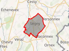 Ségny became a member of the Pays de Gex Community of Communes on 1 January 1996. The commune is bordered by Cessy to the north, Versonnex to the east, Prévessin-Moëns and Ornex to the south, and Échenevex and Chevry to the west.