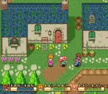 The three main characters do not have names in the original SNES release, though their names appear in the manual of the Japanese release; their names were added into the game in the iOS port worldwide. In all versions, the player can choose to name the characters whatever they wish. The hero (ランディ, Randi),[12] a young boy, is adopted by the Elder of Potos before the start of the game, after the boy's mother disappears. The girl (プリム, Primm)[12] is in love with a warrior named Dyluck, who was ordered by the king to attack Elinee's Castle. Angered by the king's actions and by her father's attempt to arrange her marriage to a local nobleman, she leaves the castle to save Dyluck and to accompany the hero as well.[13] The hero meets a sprite child (ポポイ, Popoi)[12] at the Dwarf Village. The sprite lives with a dwarf and goes with the characters to learn more about their family. It does not remember anything about its past, so it joins the team to try to recover its memories.[14]