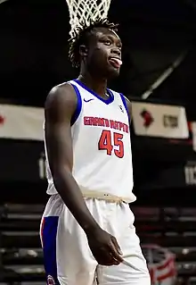On 23 November 2019, Doumbouya was recalled by the Pistons and made his NBA debut in a 104–90 loss to the Milwaukee Bucks.[50] In early January 2020, he registered double-doubles in each of his first two starts against the Los Angeles Clippers and the Golden State Warriors.[51] On 15 January, Doumbouya scored a season-high 24 points with two rebounds, an assist and a steal in a 116–103 victory over the Boston Celtics.[52] His production declined after the performance, and he scored at least 10 points in one more NBA game for the rest of the season. On 6 March, Doumbouya was assigned to the G League, recording 30 points and eight rebounds and making a game-winning jump shot in a 102–101 win over the Maine Red Claws.[53] In the 2019–20 NBA season, he averaged 6.4 points and 3.1 rebounds in 19.8 minutes per game, starting in 19 of his 38 appearances.[54]