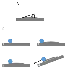 As described above, contact angle is used to characterize surface wettability. A droplet of solvent, typically water for hydrophobic surfaces, is placed perpendicular to the surface. The droplet is imaged and the angle between the solid/liquid and liquid/vapor interfaces is measured. Samples are considered to be superhydrophobic when the contact angle is greater than 150 degrees.[9] Refer to section on Wenzel and Cassie-Baxter models for information on the different behaviors of droplets on topographical surfaces. For drops to roll effectively on a superhydrophobic surface, Contact angle hysteresis is an important consideration. Low levels of contact angle hysteresis will enhance the self-cleaning effect of a superhydrophobic surface.
