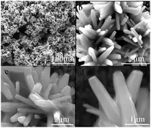 Generally, chemical deposition uses liquid or vapor phases to deposit inorganic materials or halides onto surfaces as thin films.[37] Reagents are supplied in the appropriate stoichiometric amounts to react on the surface. Types of chemical deposition include chemical vapor deposition, chemical bath deposition, and electrochemical deposition. These methodologies produce thin crystalline nanostructures.[29] For example, brucite-type cobalt hydroxide crystalline surfaces were produced by chemical bath deposition and coated with lauric acid. These surfaces had individual nanofiber tips with diameters of 6.5 nm, ultimately resulting in a contact angle as high as 178 degrees.[38]