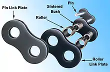 While some of the earliest self-lubricating bearings were developed by Chrysler[2] the earliest self-lubricating chains were bushed chains, which consisted of pins, plates, and sintered bushes. The loss in strength of the bush required it to be made extra thick. This made the outer diameter so large that it did not allow enough room for a roller. These bushed chains suffer from the drawback of lower allowable load and tensile strength compared to regular roller chain, and the outer diameter of the bushes do not rotate when engaging a sprocket and may suffer faster wear and damage. While various chain manufacturers offered self-lubricating bushed chain designs based on sintered-bush technology since the 1950s, the world's first[3] self-lubricating roller chain was developed and launched by a Japanese chain manufacturer in 1988.[4] After they made further improvements to the oil impregnation and sintering technologies, they received a patent for their lube-free roller chain, as evidenced by Patent #JP20070237969.[5] In the new design, advancements in powder metal bush technology allowed engineers to design a bush that had a smaller diameter yet was stronger, which allowed room for rollers. These rollers improved performance by allowing the chain to articulate more smoothly into sprockets and protect the sintered bushes. Because of these advancements, the self-lubrication style chains achieved strength on par with regular roller chain, with the added benefit of being lube-free. Powdered metal sintered bearings (in the case of roller chain, the bushes) are self-lubricating because their porosity is impregnated with lubricants during the manufacturing process. In use, frictional heat causes the lubricant to expand and flow out of the pores, forming a film between mating parts. Low coefficients of friction, minimal maintenance and trouble-free service life, low cost, and simple installation are the chief advantages of powdered metal bearings.[6][7]
