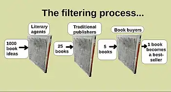 In the traditional publishing model, editors and publishers act as a filter or screen, weeding out possibly radical, badly written, or otherwise substandard content. In contrast, self-publishing enables authors to bypass this filter and sell their books directly to the public. The wide-open uncensored nature of self-publishing has caused problems and controversies with pornographic or abuse-themed content. Amazon has a policy against selling content relating to rape and incest and bestiality which states "We don't accept pornographic or offensive depictions of graphic sexual acts", but it is sometimes difficult for book distributors to distinguish what type of content is acceptable and what is not.[5] Some retailers have had to remove problematic content.[5]A survey found that self-published erotica had more extreme themes than mainstream books. Erotica is about one percent of the mainstream market but 29 percent of the self-published market, according to one informal survey in 2013.[25]