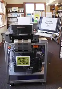 Internet transmission of digital books was combined with print-on-demand publishing with the invention of the Espresso Book Machine which was first demonstrated at the New York Public Library in 2007. This machine prints, collates, covers, and binds a single book. It is in libraries and bookstores throughout the world, and it can make copies of out-of-print editions. Small bookstores sometimes use it to compete with large bookstore chains. It works by taking two Internet-delivered pdf files, one for the text and one for the cover, and then prints an entire paperback book in a matter of minutes, which then drops down a chute.[20]