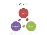 Social networking is the communication among people within a virtual social space.[4] This medium of communication allows insight into the significance of social semiotics. “Millions of people now interact through blogs, collaborate through wikis, play multiplayer games, publish podcasts and video, build relationships through social network sites and evaluate all the above forms of communication through feedback and ranking mechanisms”.[5] Social semiotics “unlike speech, writing necessitates some sort of technology in the form of person device interaction”.[6] Social semiotics functions through the triad of communication or Peircean semiotics in the form of sign, object, interpretant[7] (Chart 1) and “Human, Machine, Tag (Information)”[8] (Chart 2). In Peircean semiotics (Chart 1), "A sign…[in the form of representamen] is something which stands to somebody for something in some respect or capacity. It addresses somebody, that is, creates in the mind of that person an equivalent sign, or perhaps a more developed sign. That sign which it creates I call the interpretant of the first sign. The sign stands for an object, not in all respects, but in reference to a sort of idea which I have something called the ground of the representamen".[1]