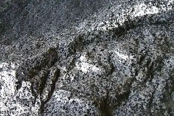 In rock climbing, Sentinel Granodiorite is noted for its dihedrals,[9] plus for having dikes. Dikes of aplite and pegmatite commonly intrude on Sentinel Granodiorite. Dikes vary in width from less than one centimeter of over one meter, are usually ten to fifteen centimeters wide. They often extend several hundred meters, and have irregularly-shaped or web-like systems that can extend several tens of square meters.[5]