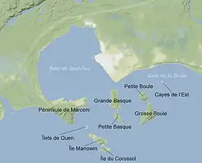 The Sept Îles Archipelago protects the mouth of the Sept Îles Bay on the north shore of the Gulf of Saint Lawrence about 250 kilometres (160 mi) east of Baie-Comeau and 250 kilometres (160 mi) west of Havre-Saint-Pierre. It is just north of the 50th parallel in Sept-Îles, in the Sept-Rivières Regional County Municipality of Quebec.[1] The bay lies between the Marconi peninsula to the west and Pointe aux Basques to the east. The islands are Petite Boule, Grosse Boule, Grande Basque, Petite Basque, île du Corossol, île Manowin and the îlets De Quen.[1]