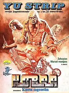 Starting as an Eks spin-off in 1977, the YU strip magazine turned to be the seminal publication for Serbian authors. Teamed up with writer Svetozar Obradović, Branislav Kerac had already debuted with Lieutenant Tara in the Zlatni kliker magazine.[28] The duo went on to create Kobra, the most popular Yugoslav comic of the 1980s. Kerac's super-heroine Cat Claw reached even greater success abroad.[29] A number of local creators (Zoran Janjetov, R.M. Guera, Darko Perović, Zoran Tucić, Vujadin Radovanović, Željko Pahek, Dejan Nenadov, Vladimir Krstić and many others) published their early stories in YU strip before they went on to work for foreign publishers. The magazine lasted for 85 issues and ended in 1987.