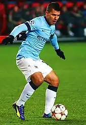 Sergio Leonel Agüero del Castillo (born 2 June 1988), also known as Kun Agüero,[5] is an Argentine former professional footballer who played as a striker. He is considered one of the best strikers of his generation and one of the greatest players in the history of the Premier League, during his decade-long association with Manchester City.[6][7][8]