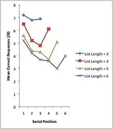 In serial memory processing, Primacy effect and Recency effect effects for accuracy of recall are commonly found. These effects are found for both visual[4] and auditory[5] stimuli in memory tasks. This means that of the many items in a memory set during serial memory processing, the first item and the last seem to be recalled faster and more accurately than the other items. These effects may exist if recall errors are due to serial position. It is theorized that items are mistaken for other items from a nearby position in the memory set (e.g. the 5th item is mistaken for the 4th item or the 6th item). Since there are more nearby serial positions to middle items in a set, there are therefore more opportunities for mixing-up items. On the other hand, there are very few serial positions nearby to the first and last position, and therefore these positions may be remembered more accurately (or mistaken less). The first and last position may be less error-prone positions and more easily recalled.[6]