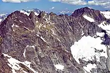 Seven Fingered Jack is the second-highest and middle of the three peaks of the Entiat Cirque, the other two being Mount Maude and Mount Fernow. All three are over 9,000 feet (2,700 m).[5] Together they form a high, curved ridge from which the headwaters of the Entiat River flow eastward. There are a number of glaciers on Seven Fingered Jack and its neighbors, including Entiat Glacier. Streams flowing down the east and south sides of the mountain enter Spider Meadows, through which flows Phelps Creek, a tributary of the Chiwawa River, which flows south to the Wenatchee River. Thus Seven Fingered Jack sits on the boundary between the drainage basins of the Entiat and Wenatchee rivers. Both rivers are tributaries of the Columbia River.[6]