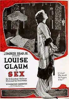 Sex is a 1920 American silent drama film directed by Fred Niblo, written by C. Gardner Sullivan, produced by J. Parker Read, and starring Louise Glaum.[1] On its surface, the film was a morality story on the evils of marital infidelity. However, the film's producer, J. Parker Read, had made a series of pictures on sex themes. The release of Sex, with its provocative title and explicit scenes of seduction and debauchery, made it the subject of controversy among censors and commentators.