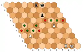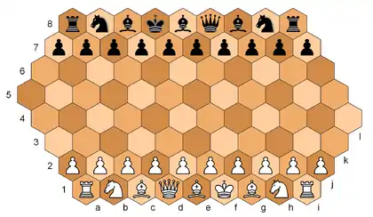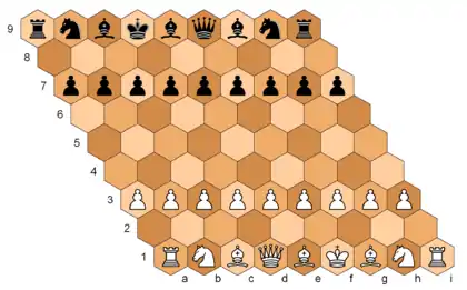 The game is played on a vertically oriented regular hexagonal board with sides 6 cells long, which has 91 hex cells having three colours (light, dark, and mid-tone), with the middle cell (or "hex") usually mid-tone.[4] The usual set of chess pieces is increased by one bishop and one pawn. The board has 11 files, marked by letters a–l (letter j is not used), and 11 numbered ranks (which bend 60° at file f). Ranks 1–6 each contain 11 cells, rank 7 (filled with black pawns in the initial setup) has 9 cells, rank 8 has 7, and so on. Rank 11 contains exactly one cell: f11.