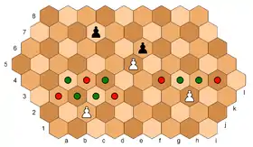 In 1978–79 Dave McCooey and Richard Honeycutt developed another variation of hexagonal chess very similar to Gliński's, having four differences: the starting array (including seven pawns per side instead of nine); the pawn's capturing move; pawns on the f-file are not permitted an initial double step; and stalemate is counted as a draw (players receive half a point).[10]