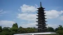 During the Tang and Song dynasties, Qinglong Town (青龙镇[lower-alpha 5]) in modern Qingpu District was a major trading port. Established in 746 (the fifth year of the Tang Tianbao era), it developed into what historically called a "giant town of the Southeast", with thirteen temples and seven pagodas. Mi Fu, a scholar and artist of the Song dynasty, served as its mayor. The port experienced thriving trade with provinces along the Yangtze and the Chinese coast, as well as with foreign countries such as Japan and Silla.[2]
