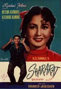 Shararat meaning "Mischief" is a 1959 romantic drama film written and directed by Harnam Singh Rawail, starring Meena Kumari, Kishore Kumar, Raaj Kumar and Kumkum in lead roles, with the memorable song "Hum Matwale Naujawan" sung by Kishore Kumar.[1][2] Tragedy Queen Meena Kumari matched the boisterous Kishore Kumar. This film is also unique because it featured Kishore Kumar singing his own songs, two versions of a classical raga based song ("Ajab Hai Daastaan Teri Yeh Zindagi") that were picturised on Kishore Kumar were sung by Mohammad Rafi, on Kishore Kumar's insistence.