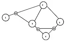|  Example of original topology of a network |  The transformed graph |  This graph meets the restriction 1 because the node 3 has a degree of 3 meanwhile it only has 2 incident SRLGs |