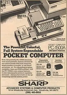The Sharp PC-1500 was a pocket computer produced by Sharp during 1981-1985. A rebadged version was also sold as the TRS-80 Pocket Computer PC-2.