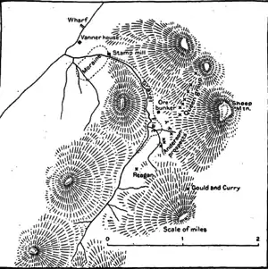 The formations of Gold Creek extend without interruption southeastward to Taku Inlet, but only the two outer divisions—namely, the black slate and the group of green stones and intercalated slate—are cut by Sheep Creek. On the ridge between Gold and Sheep creeks, the band of slates with their intrusive dikes of dark diorite is about 6,800 feet (2,100 m) across and this width is only slightly diminished in the vicinity of the Grindstone Creek divide, 3.5 miles (5.6 km) distant. The black slates contain dikes of dark diorite (altered gubbro), which follow the general trend of the formation. However, these rocks have not been greatly affected by vein waters. On the southeast ridge of Sheep Mountain and extending southeastward for 1.5 miles (2.4 km) is a somewhat irregular dike of the Coast Range-type of diorite. This rock has been impregnated to a certain extent by sulphides and locally contains stringers of quartz. This intrusion cuts a dike of the dark diorite.[2]