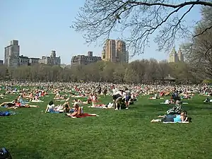 In its earliest years, Sheep Meadow was also known as "the Commons" or "the Green".[13][18] For the first few decades of Central Park's existence, it was forbidden to play most sports in Central Park, because Olmsted and Vaux believed that the park should be used for scenic enjoyment rather than recreation.[19] As such, in the park's earliest years, Sheep Meadow was only available to the public during certain times such as on Saturdays, as indicated on signs posted on the meadow's perimeter.[13][18] By the 1870s, the park's patronage increasingly came to include the middle and working class, and strict regulations were gradually eased, such as those against public gatherings.[20] Though certain sports such as lacrosse, tennis, American football, and roller skating were allowed during the 1880s, the commissioners were still reluctant to repeal the "keep off the grass" rules.[21] However, by the 1890s, the regulations against walking on the grass had also been repealed.[22] Tennis nets were installed in Sheep Meadow in 1915 due to the large number of tennis permits distributed by the city that year.[23]: 13 (PDF p. 8)