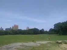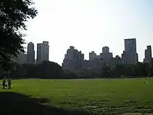 When the location of Sheep Meadow was decided, some small communities of poorer New Yorkers were uprooted, including Irish, Germans and African-Americans.[6] Sheep Meadow was to be located in a relatively flat 10-acre (40,000 m2) patch of land within the park site.[7] To produce the almost 15 acres (61,000 m2) of "level or but slightly undulating ground" in the specifications, the ten acres of poorly-draining ground was filled to a depth of 2 feet (0.61 m) with fill from New Jersey. Additionally, large boulders and a rocky ridge that stood 16 feet (4.9 m) out of the finished grade were blasted out, and the reshaped landscape was covered with topsoil.[7][8] Sheep Meadow was the most expensive project within the park.[4] It was the largest meadow in Central Park until the old Croton Aqueduct collecting reservoir was emptied and made into the Great Lawn in 1937.[9]
