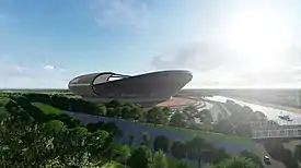 Sheikh Hasina International Cricket Stadium or The Boat is an under-construction cricket stadium located in Sector-I of multi-billion dollar Purbachal New Town on the outskirts of Dhaka, Bangladesh.[2] The stadium is a joint venture of National Sports Council and Bangladesh Cricket Board. Planned to open in 2022, the stadium will serve as the home to Bangladesh national cricket team and Dhaka Dynamites of Bangladesh Premier League (BPL).[3] It is located in about 38 acres (15 ha) of land east of Turag River at Purbachal Express Highway. Groundbreaking of the ৳1100 crore (US$130 million) stadium began in November 2019 and is expected to be completed by December 2022.[4] Upon completion in 2022, The stadium will become the third largest-ever cricket stadium in terms of capacity, and the most expensive cricket stadium in Asia.[5][6][7][8]