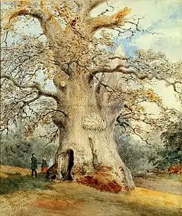 The Shelton Oak was pictured in Jacob George Strutt's 1822 book Sylva Britannica.[4] In 1823 it was recorded to be at least 41 feet 6 inches (12.65 m) high; 44 feet 3 inches (13.49 m) in circumference at ground level and 27 feet 4 inches (8.33 m) at a height of 8 feet (2.4 m). It was also noted that the hollow trunk had "sufficient room for, at least, half a dozen to take a snug dinner".[5] Until 1824, when it was sold, the land the oak stood upon was owned by the Mytton family.[6] A report from this year noted that at a height of 1 foot 6 inches (0.46 m) the circumference of the oak was 37 feet (11 m) and at 5 feet (1.5 m) the circumference was 26 feet (7.9 m).[2] It was noted at this time that the hollow trunk could accommodate 20 people.[1]