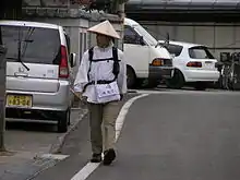 The pilgrim's traditional costume comprises a white shirt (白衣, oizuru), conical Asian hat (すげ笠, suge-kasa), and staff (金剛杖, kongō-zue). This may be supplemented by a ceremonial stole (輪袈裟, wagesa). The henro also carries a bag (頭陀袋, zuda-bukuro) containing name slips (納札, osame-fuda), prayer beads (数珠, juzu) (also known as nenju (念珠)), a booklet (納経帳, nōkyō-chō) to collect stamps/seals (朱印, shuin), incense sticks (線香, senkō), and coins used as offerings (お賽銭, o-saisen). The more religiously-minded henro may also carry a book of sutras (経本, kyōbon) and go-eika (ご詠歌) set with a bell.[9]