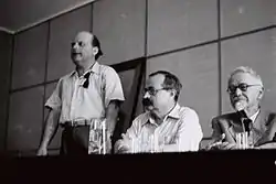 Shin Shalom (standing) with Asher Barash (centre) and Nahum Slouschz (right), photographed during a Hebrew writers' conference in 1948