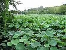The lotuses of Lotus Pond, fully grown in summer, cover the entire surface of the water, hiding it almost completely.