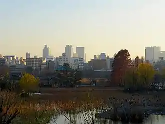 The Shinobazu Pond (不忍池, Shinobazu no Ike) is a pond within Ueno Park (a spacious public park located in the Ueno section of Taitō, Tokyo, Japan), and a historically prominent Shitamachi feature often appearing in history and works of art. The park occupies the site of the former Kan'ei-ji, a temple closely associated with the Tokugawa shōguns, who had built it to guard Edo Castle against the northeast, a direction believed to be unlucky by traditional geomancy. The temple was destroyed during the Boshin War. The pond, although modified many times and even once drained, is natural.