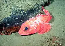 The shortspine thornyhead (Sebastolobus alascanus), also known as the channel rockcod, shortspine channel rockfish or spinycheek rockfish, is a species of marine ray-finned fish belonging to the subfamily Sebastinae, the rockfishes, part of the family Scorpaenidae. It is sometimes referred to as the "idiot fish" or "idiot cod" due to its large oversize head/eyes. It is found in the northern and northeastern Pacific Ocean.