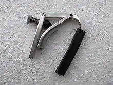 The Shubb Capo utilises an over-centre locking action, which is lever operated.[6][7][8] The design includes a screw for adjusting the clamp's tightness, and has been described as "a turning point in modern capo design."[9]