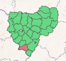 Shumyachsky District (Russian: Шумячский райо́н) is an administrative[1] and municipal[5] district (raion), one of the twenty-five in Smolensk Oblast, Russia. It is located in the southwest of the oblast and borders with Khislavichsky District in the north, Pochinkovsky District in the northwest, Roslavlsky District in the east, Yershichsky District in the southeast, Klimavichy District of Mogilev Region of Belarus in the south, and with Krychaw and Mstsislaw Districts, also of Mogilev Region, in the west. The area of the district is 1,367.70 square kilometers (528.07 sq mi).[1] Its administrative center is the urban locality (a settlement) of Shumyachi.[1] Population: 10,713 (2010 Census);[2] 14,032 (2002 Census);[7] 17,678 (1989 Census).[8] The population of Shumyachi accounts for 39.5% of the district's total population.[2]