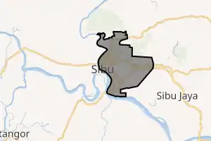Sibu /ˈsiːbuː/ (simplified Chinese: 诗巫; traditional Chinese: 詩巫; pinyin: Shīwū) is an inland city in the central region of Sarawak. It is the capital of Sibu District in Sibu Division, Sarawak, Malaysia. The city is located on the island of Borneo and covers an area of 129.5 square kilometres (50.0 sq mi).[12] It is located at the confluence of the Rajang and Igan Rivers,[13] some 60 kilometres from the South China Sea[14] and approximately 191.5 kilometres (119 mi) north-east of the state capital Kuching.[15] Sibu is mainly populated by people of Chinese descent, mainly from Fuzhou. Other ethnic groups such as Iban, Malay and Melanau are also present, but unlike other regions of Sarawak, they are not as significant.[16] The cities population as of 2010 is 162,676.[7]