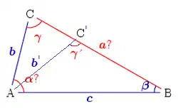 2. If b < c, the angle γ may be acute: γ = arcsin D or obtuse: γ′ = 180° − γ. The figure on right shows the point C, the side b and the angle γ as the first solution, and the point C′, side b′ and the angle γ′ as the second solution.