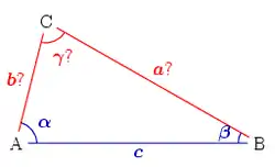 Let three side lengths a, b, c be specified. To find the angles α, β, the law of cosines can be used:[3]