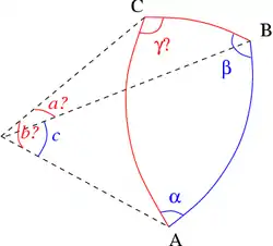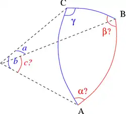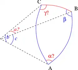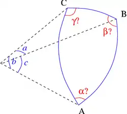 Known: the sides a, b, c (in angular units). The triangle's angles are computed using the spherical law of cosines: