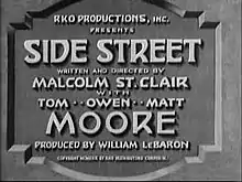 Side Street is a 1929 American Pre-Code film featuring the only screen teaming of all three Moore Brothers (Tom, Owen, and Matt), each of them major silent film stars. George Raft also makes an uncredited appearance as a professional dancer — which Raft was at the time — dancing to the song "Take a Look at Her Now", sung by June Clyde.[3] Side Street was directed by Malcolm St. Clair with a screenplay by George O'Hara and Jane Murfin, based on a story by St. Clair, which was adapted by John Russell.[1][4]