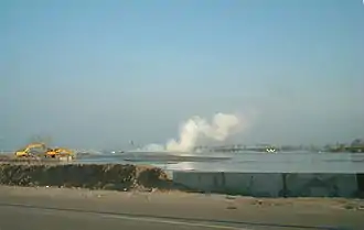 At its peak it spewed up to 180,000 cubic meters (240,000 cu yd) of mud per day.[4] By mid August 2011, mud was being discharged at a rate of 10,000 cubic meters (13,000 cu yd) per day, with 15 bubbles around its gushing point. This was a significant decline from the previous year, when mud was being discharged at a rate of 100,000 cubic meters (130,000 cu yd) per day with 320 bubbles around its gushing point.[5] It is expected that the flow will continue for the next 25 to 30 years.[4][6] Although the Sidoarjo mud flow has been contained by levees since November 2008, resultant floodings regularly disrupt local highways and villages, and further breakouts of mud are still possible.[7]